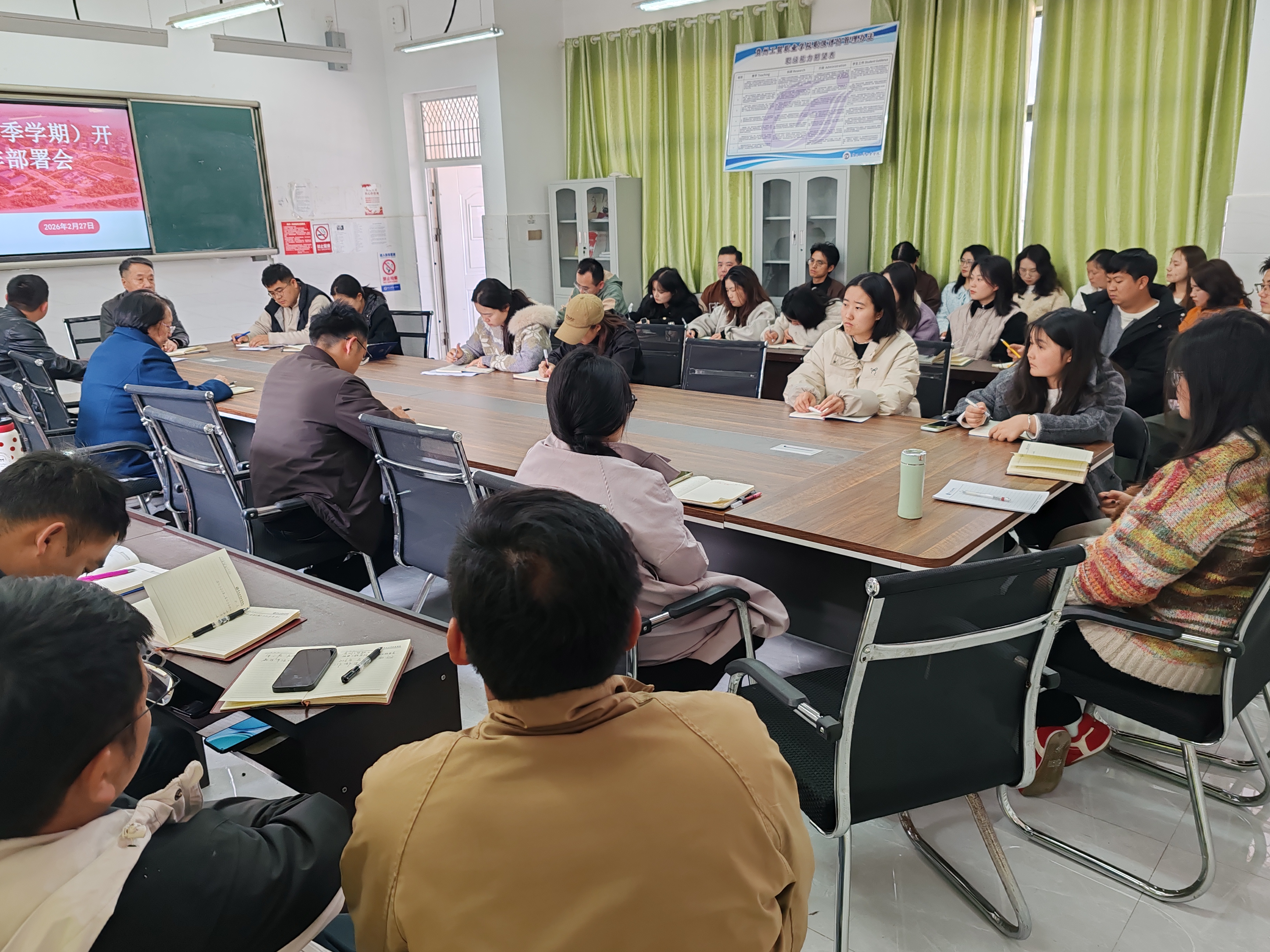 会上,学院领导围绕新学期启动工作,对教学、行政、团委、学生管理等工作进行详细安排部署。教学工作方面,要求各教研室迅速核实教师到岗情况,组织开展寒假备课初步检查,教师需在今明两天完善教案、PPT 等全套教学资料,确保备课达四周以上,学院将进行专项检查;开展教学能力考核,实操课程教师提前完成实训室实操演练;全体教师于当日下班前完成多媒体、实训室等教学设备排查,辅导员需在 3 月 1 日前完成教室设施排查与卫生大扫除,迎接校领导专项检查。同时,需加快完成上学期教学档案资料整改,3 月 12 日前以教研室为单位上交教务科归档;行政工作上,要求各科室当日上报办公设备耗材需求与维修申请,办公室统筹协调调配;本学期要加大新闻宣传工作力度,规范党政联席会议议题申报流程,近期将制定出台各科室及专任教师的岗位职责与岗位标准,启动学院 OKR 制定工作。团委与学生工作方面,团委、学生会将配合学工处开展学生走访关怀,辅导员动员学生依托各类平台开展专业特色活动;本学期将继续重点推进校风、教风、学风 “三风建设”,形成教学与学生管理联动机制,会后将召开辅导员专题会议细化落实。