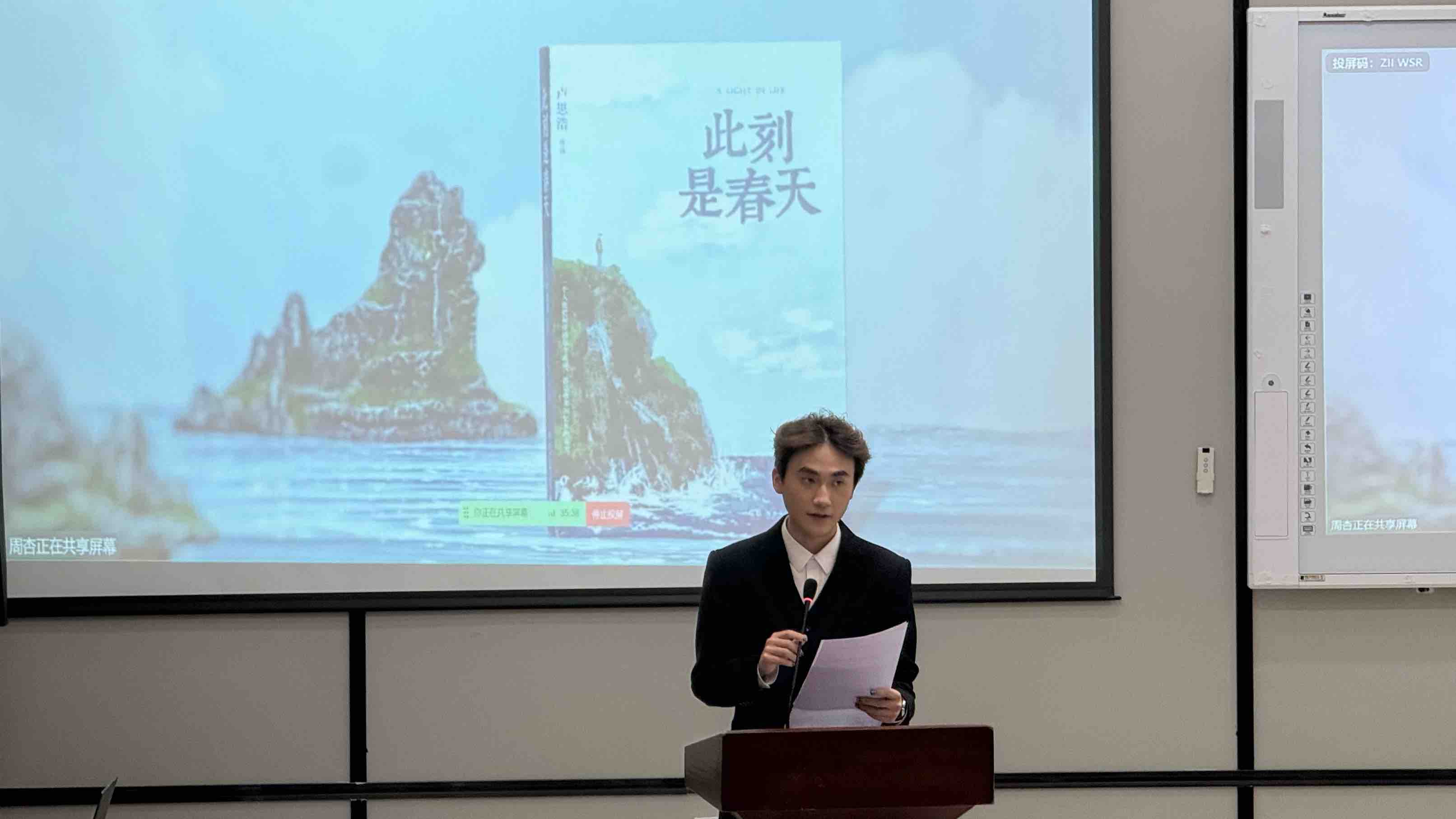 个人分享结束后,活动进入书评赏析环节。现场播放了一段关于重点推荐书籍的评论视频,内容涵盖作品背景介绍与文本分析。视频播放完毕后,主持人组织在场学生进行了简短交流讨论。