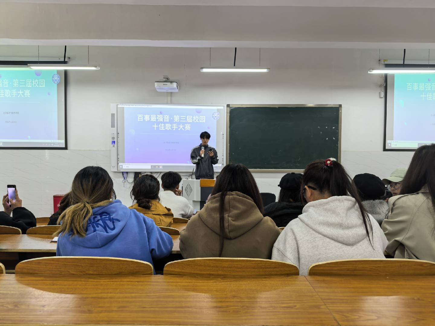 比赛现场气氛热烈,座无虚席,掌声与欢呼声此起彼伏,青春气息扑面而来。选手们风格各异、各展所长,演唱曲目涵盖流行金曲、经典民谣等多种类型:或激情澎湃,用强劲节奏点燃全场热情;或婉转悠扬,以细腻唱腔诉说动人故事。他们怀揣对音乐的热爱与执着,以真挚的情感、扎实的唱功和富有感染力的舞台表现,将每首歌曲的内涵诠释得淋漓尽致,为现场师生呈现了一场精彩绝伦的视听盛宴,台上台下热情互动,整个赛场洋溢着青春的活力与激情。