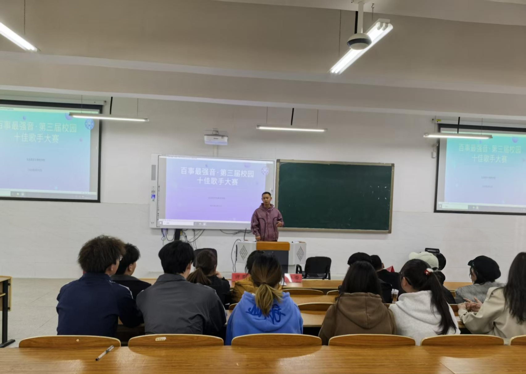 为丰富校园文化生活,展现学子昂扬向上的精神风貌,搭建艺术展示与自我表达的舞台,4月23日,生态医药与康养学院在三教一阶举办“百事最强音”第三届校园十佳歌手大赛(院赛)。赛事以音乐为纽带,汇聚热爱、唱响初心,为全院师生献上了一场热血与温情交织的视听盛宴。比赛邀请团委科员李成祥、教务科员杨仕凯、专职辅导员张丽担任评委,从演唱技巧、舞台表现、情感表达等多维度进行综合评分。
