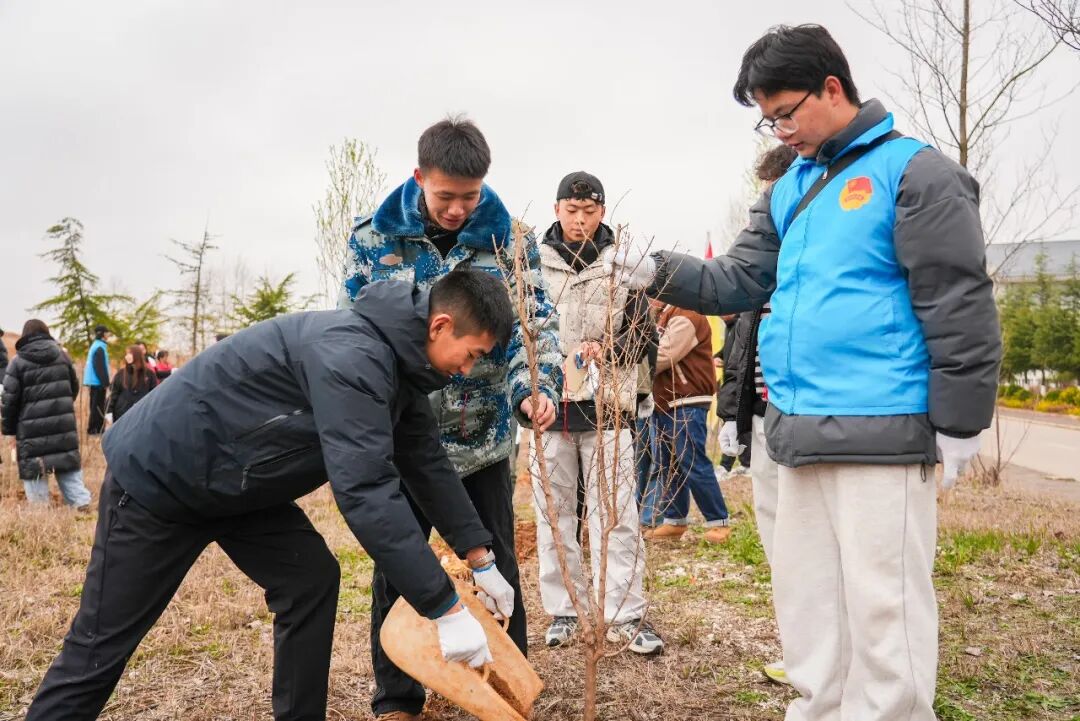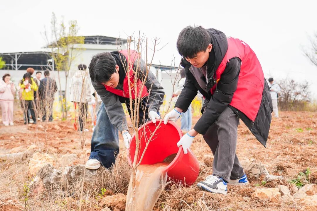 活动现场,人头攒动,热情洋溢。师生们分工协作、默契配合,挥锹铲土、扶苗填坑、提水浇灌,每一个环节都一丝不苟。经过一番辛勤劳动,56株象征团结与希望的石榴树在春风中昂然挺立,为初春的校园增添勃勃生机。