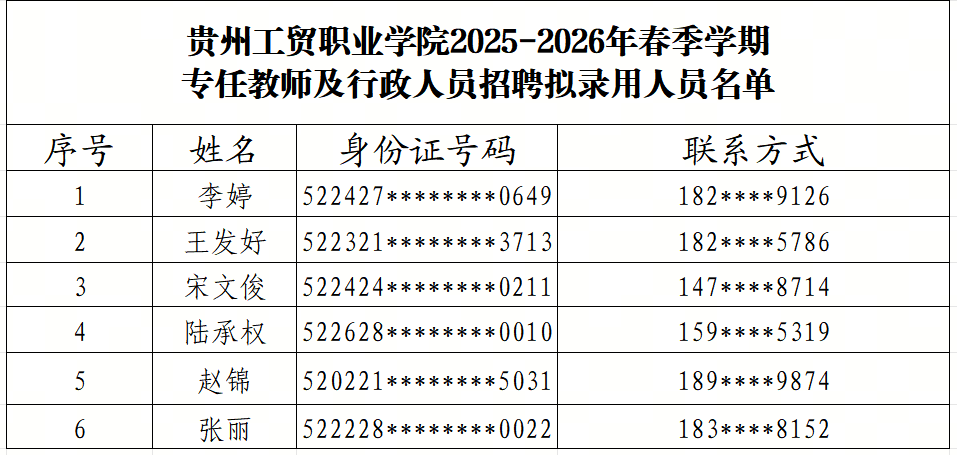 根据《贵州工贸职业学院2025—2026年春季学期专任教师及行政人员招聘公告》要求,经简历初筛、笔试、面试(试讲)、综合评价,经学校研究决定,拟聘用以下同志(名单附后)到我校工作,现予以公示: