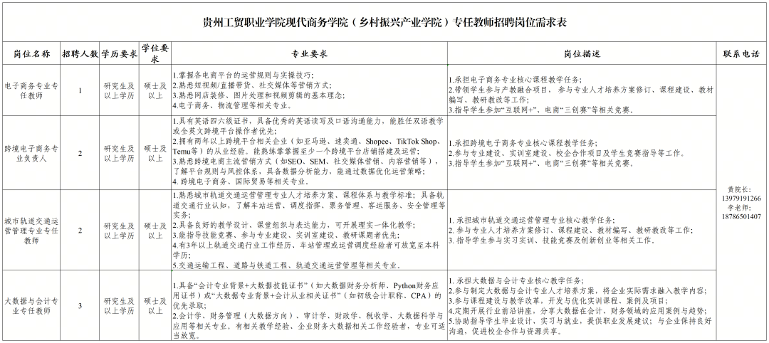 根据工作需要,我校拟面向社会公开招聘专任教师8名,详见附件:贵州工贸职业学院2026年春季学期现代商务学院(乡村振兴产业学院)专任教师招聘岗位需求表。海外院校毕业生取得的学历学位证书应获得国家教育部认证、2026年普通高校应届毕业生未取得毕业证书、学位证书的可先行报名及笔试、试讲,经笔试、试讲、体检、考察、公示并于2026年12 月 31 日之前取得毕业证书、学位证书的,可按规定聘用,否则不予聘用。