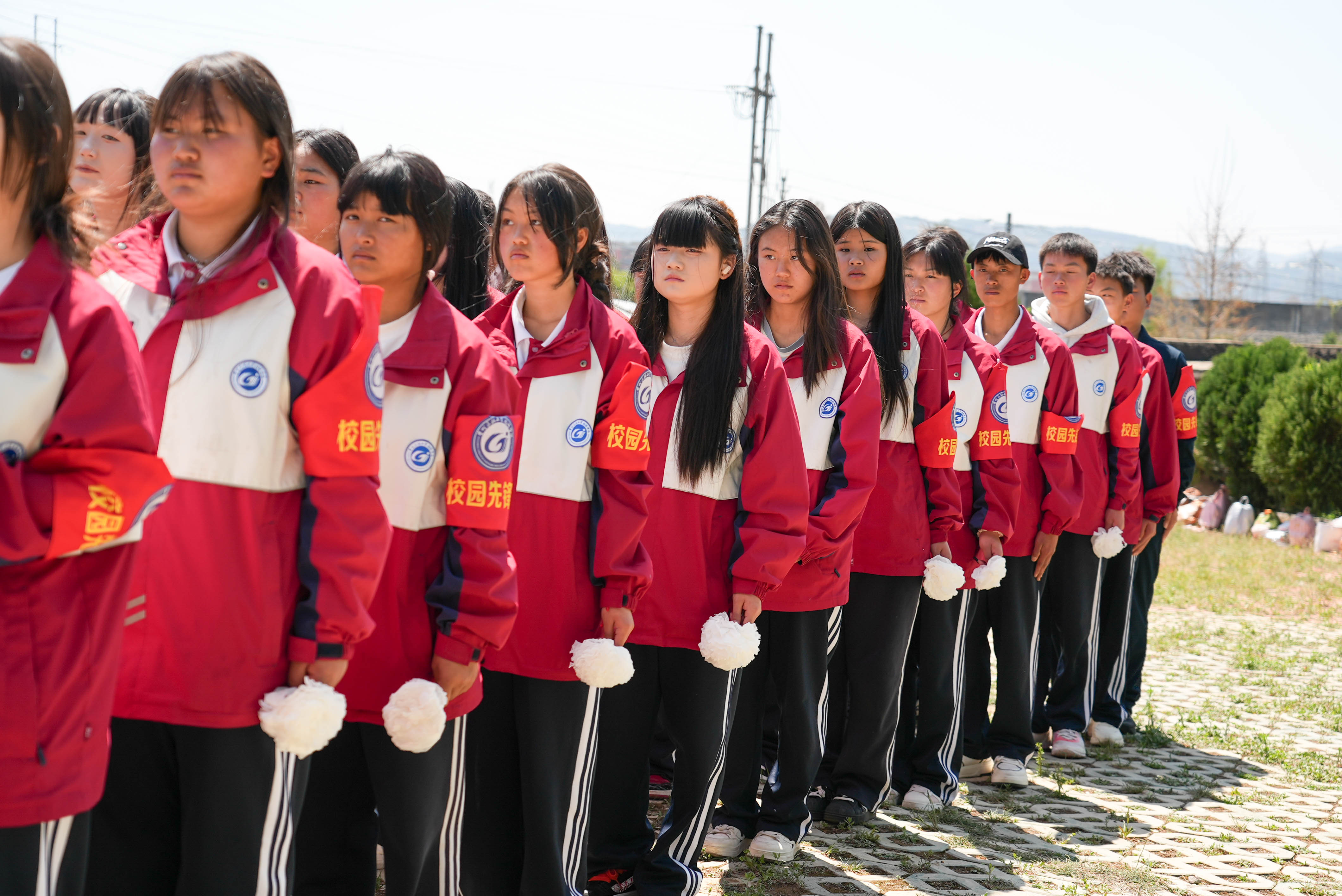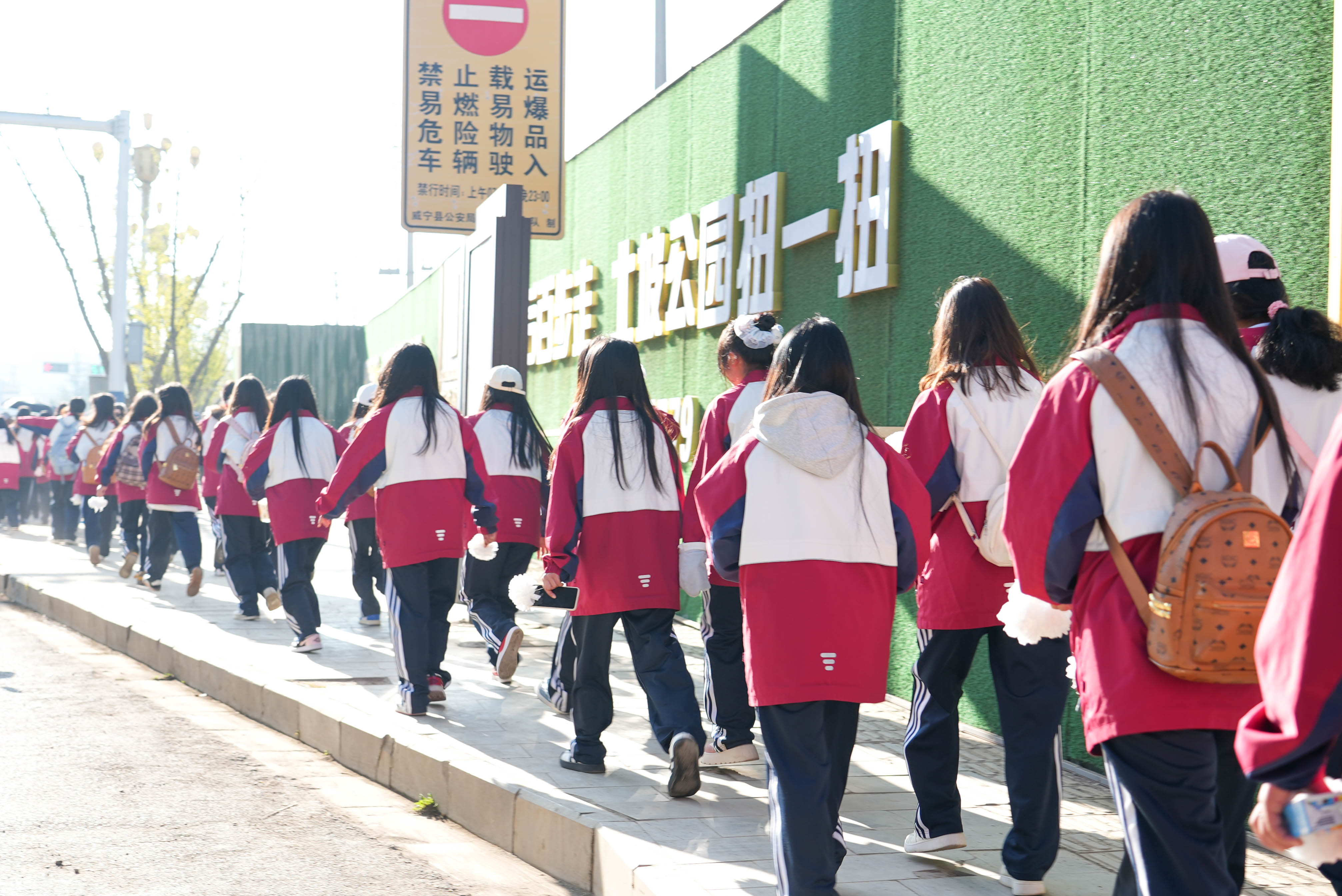 早上8时20分,队伍从学校准时出发。党员教师走在队伍前列,各班班主任全程陪同,救护车和机动保障车辆随行。一路上,体力好的同学主动帮同伴背包,老师们不时提醒大家注意安全、补充水分。